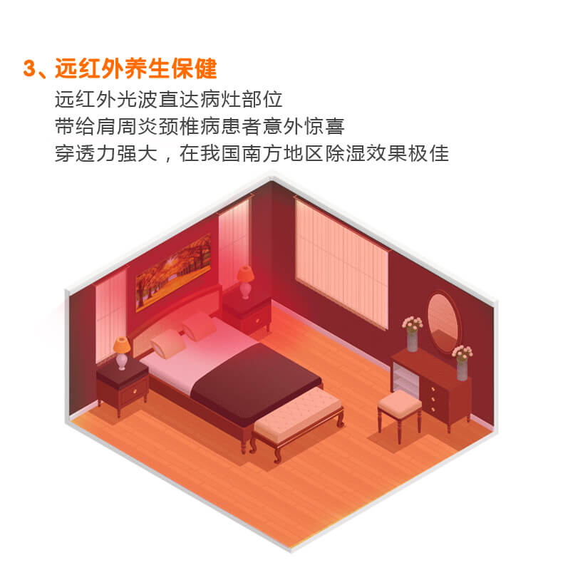 3.调节室内温度,有家有阳光(远红外技术仿太阳辐射温暖,寒冷的时候给家暖暖的感觉。)